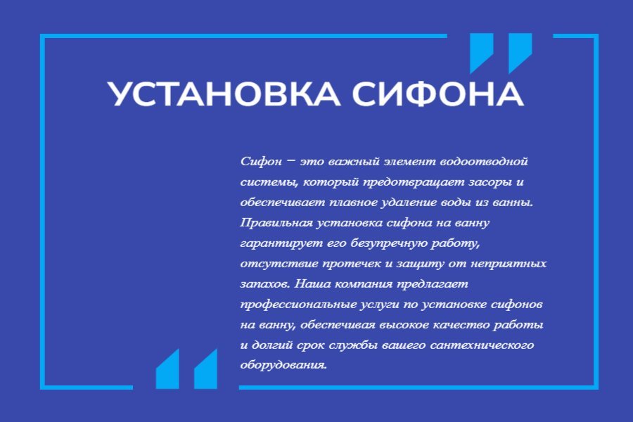 - Индивидуальный подход. Каждая ванна и система водоотведения уникальны, поэтому мы учитываем все особенности вашего оборудования и пожелания при установке сифона. Наши мастера помогут вам выбрать оптимальный вариант сифона, который обеспечит надежное и долговечное функционирование вашей системы.